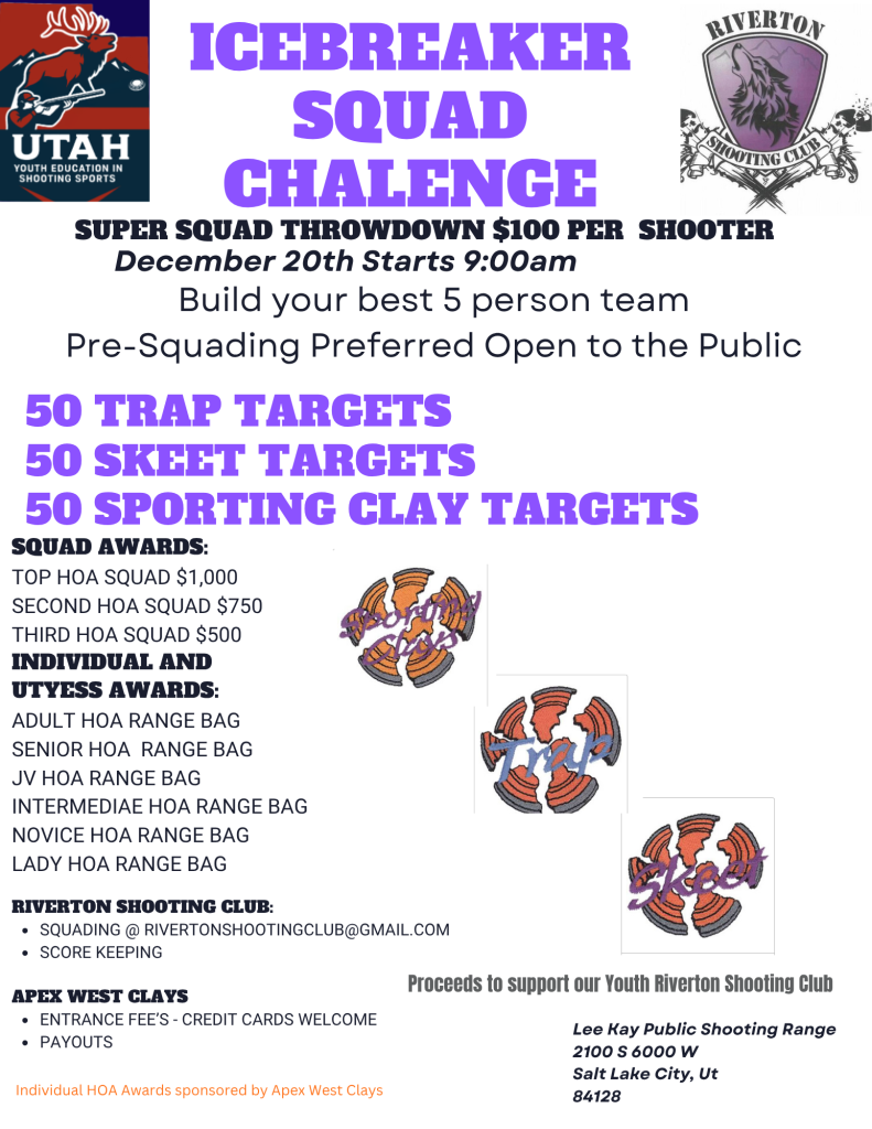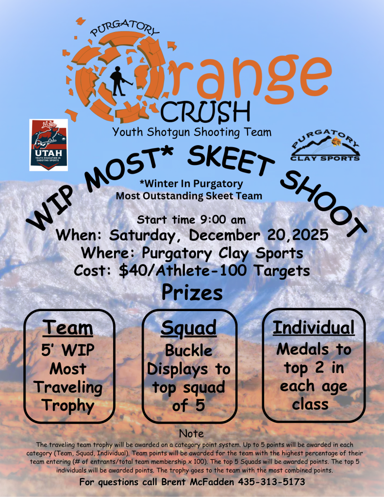 Winter in Purgatory Most Outstanding Skeet TeamDecember 20th, 2025 @ 9:00am @ Purgatory Clay Sports$40 / Athlete - 100 TargetsFor questions call Brent McFadden 435-313-5173