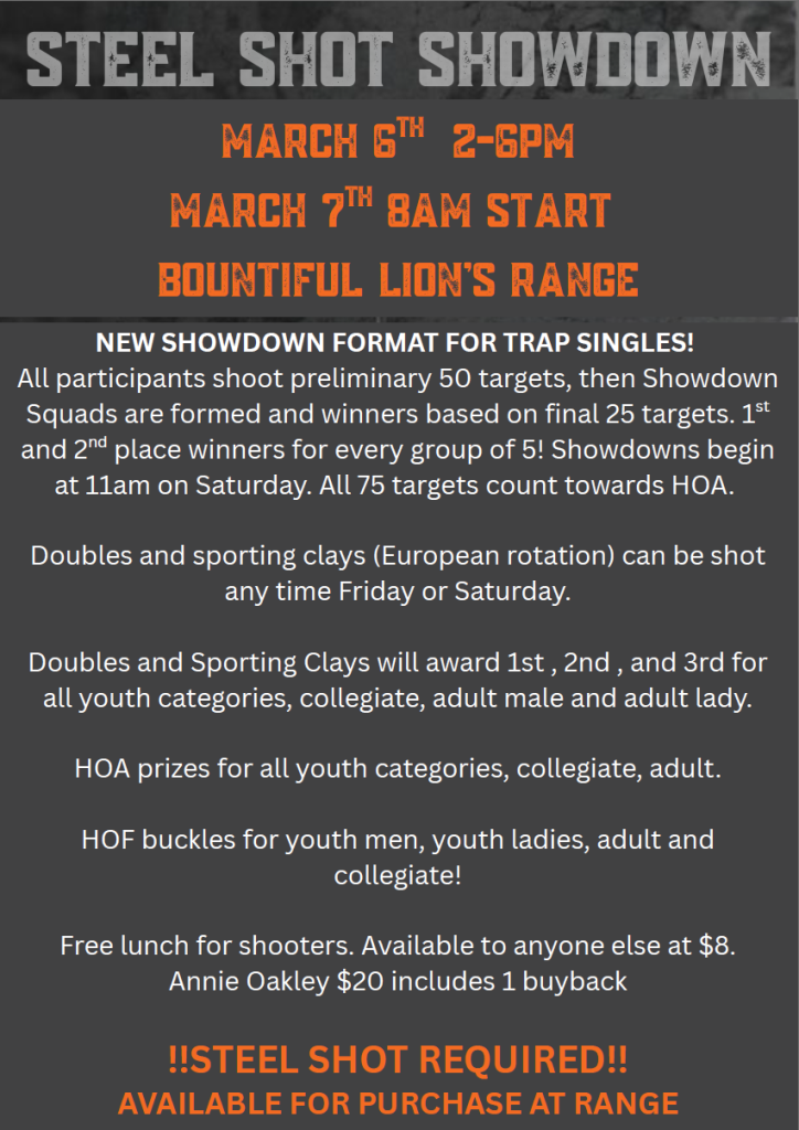 Steel Shot Showdown @ Bountiful Lion's Range, March 6th & 7thFriday 2pm - 6pmSaturday 8am - finish